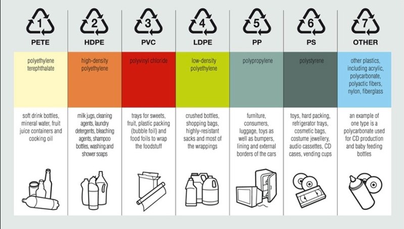 플라스틱은 원료에 따라 다음과 같이 ▶PETE ▶HDPE ▶PVC ▶LDPE ▶PP ▶PS ▶OTHER 7가지로 나뉜다. 흔히 우리가 배달에 사용하는 플라스틱은 플라스틱에 비닐이 섞인 OTHER에 분류되는 플라스틱이다. 그렇게 두 가지 재질이 섞이면 재활용이 불가하다. 종이컵도 마찬가지로 내부에 플라스틱의 일종인 폴리에틸렌(PE)을 발라 일반 종이로 분류되어 재활용 되지 않는다. 일회용 플라스틱 컵도 재질이 섞여 있어 재활용이 불가하다.